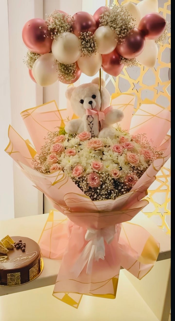 Beautifully arranged bouquet with teddy and a cake for any association birthday,anniversary,engagement