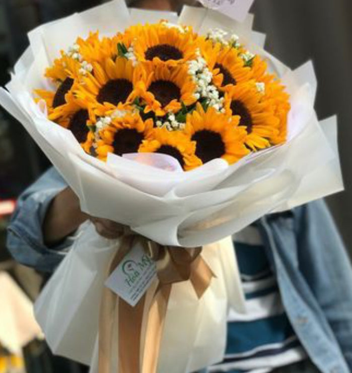 A cheerful and elegant bouquet featuring bright, golden sunflowers paired with delicate white baby’s breath. This stunning combination brings warmth, joy, and a soft touch of elegance—perfect for birthdays, thank-you gifts, or simply adding sunshine to someone’s day. Handpicked and carefully wrapped to ensure every bloom arrives fresh and beautiful, ready to brighten any space with its natural charm.